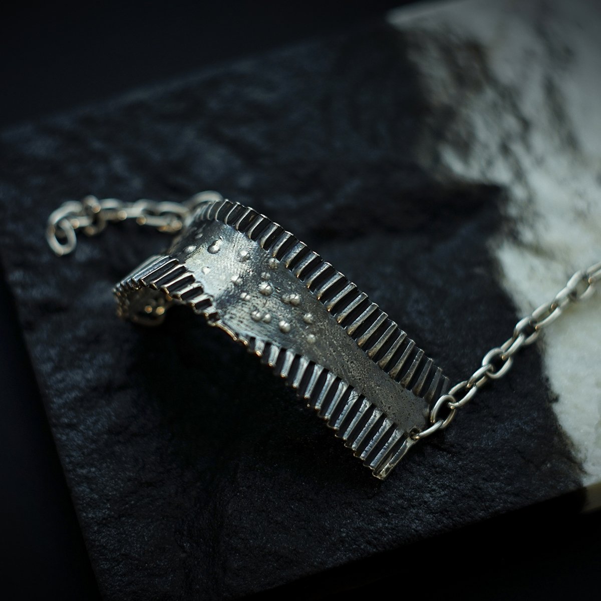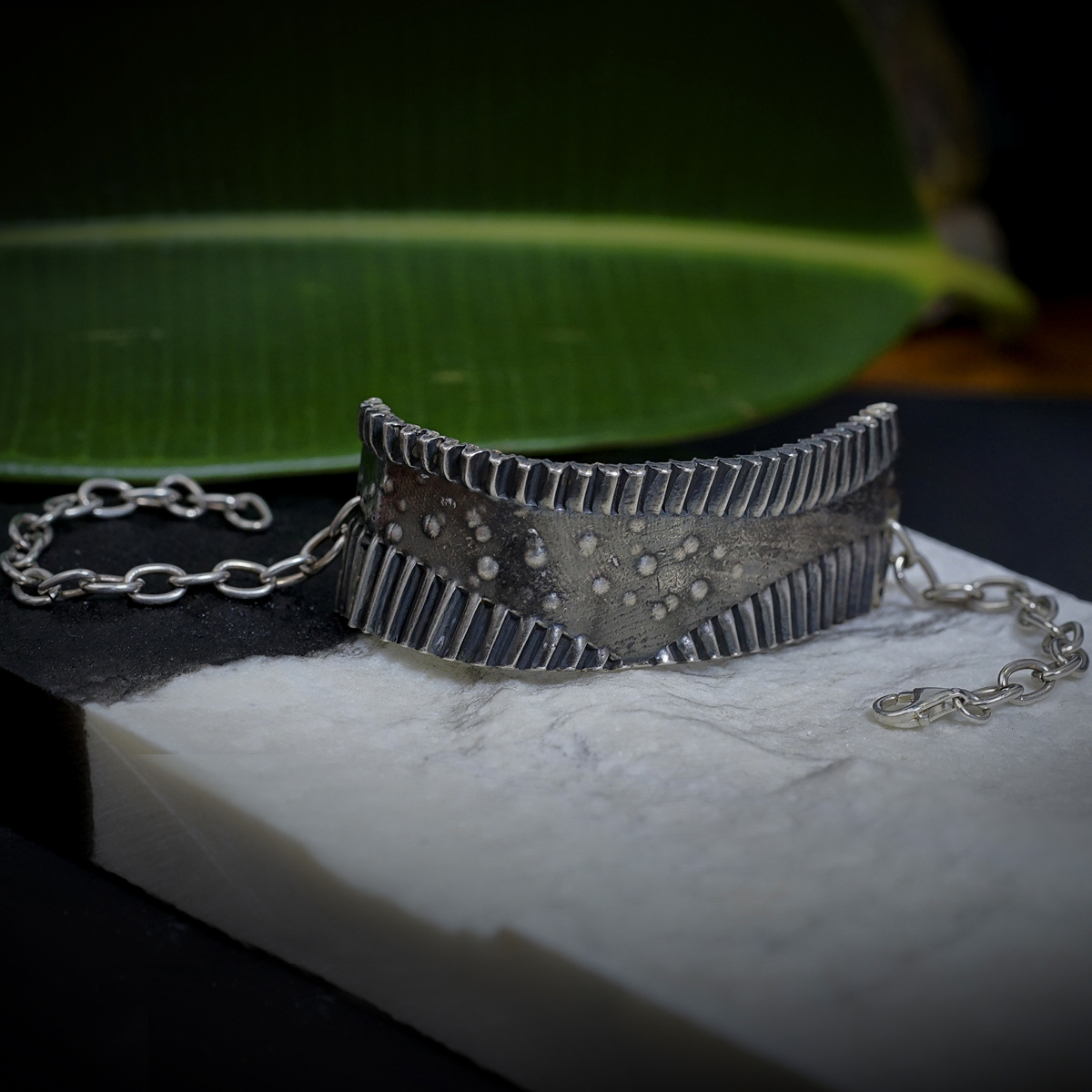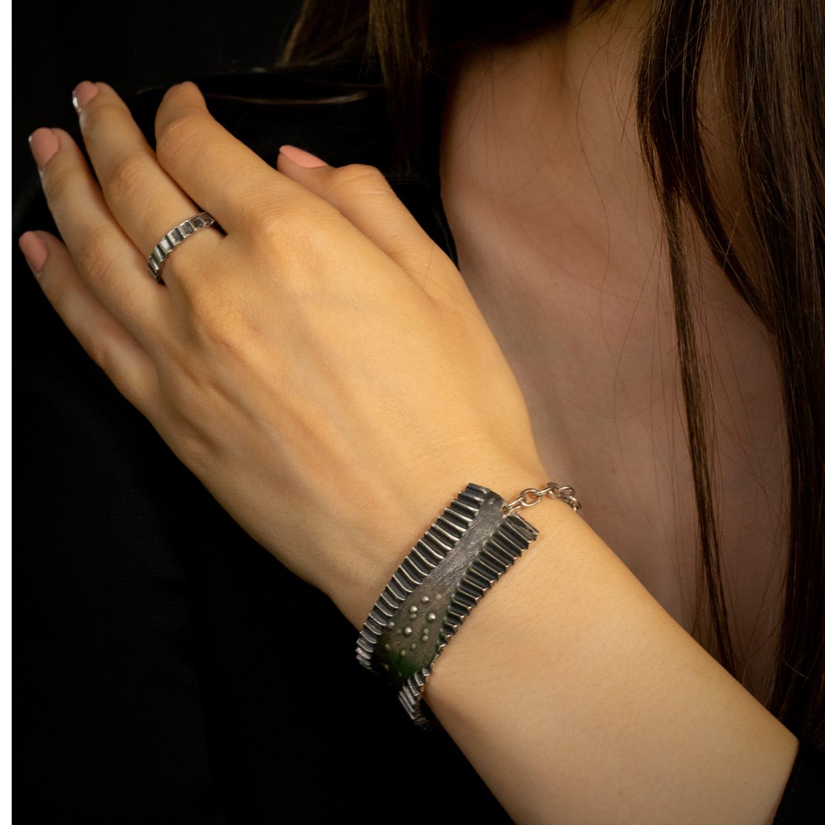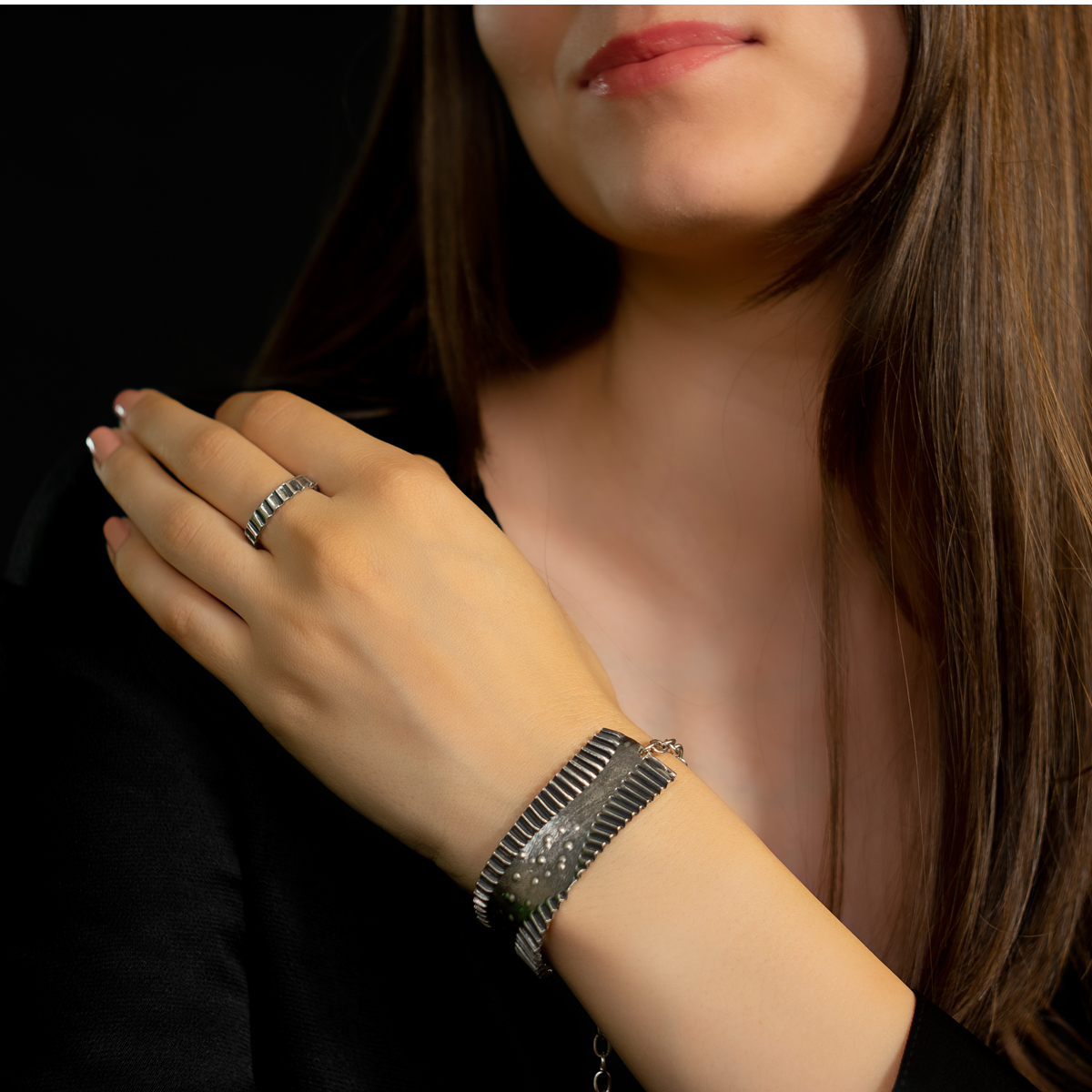 O brățară de argint masivă care se așează delicat pe închietura mâinii tale și se prinde cu un lănțișor ca într-o îmbrățișare puternică și caldă. Ca o poartă neclintită care să nu lase nimic nociv să pătrundă. Ca o fortăreață în care să te simți protejată.