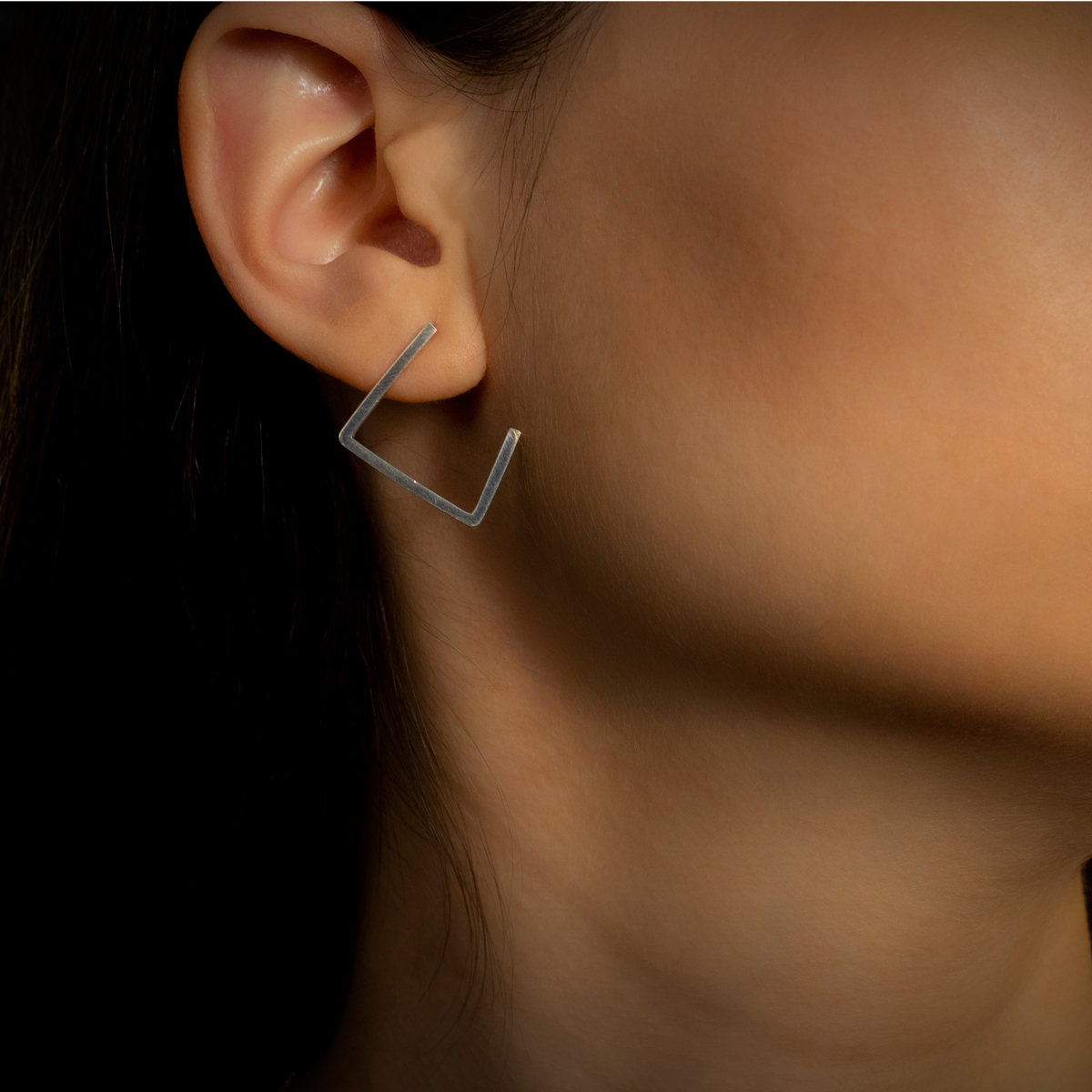O pereche de cercei din argint lucrați manual din dragostea pentru forme geometrice. Discreți, acești cercei te duc cu gândul la aspirația către perfecțiune. Cu un design minimalist, îți pun în valoare trăsăturile oriunde alegi să îi porți.