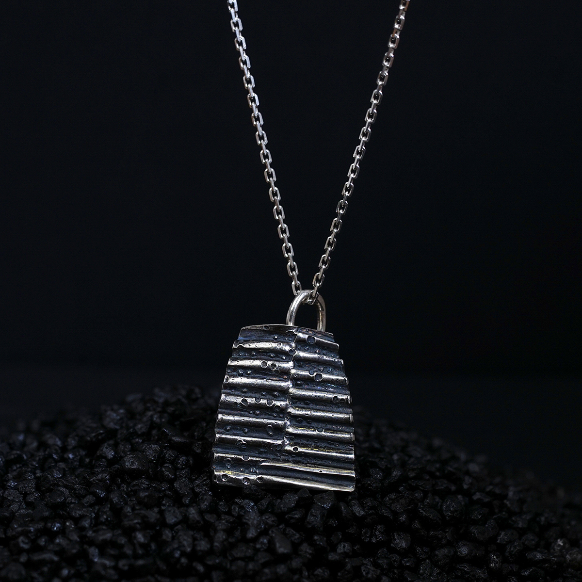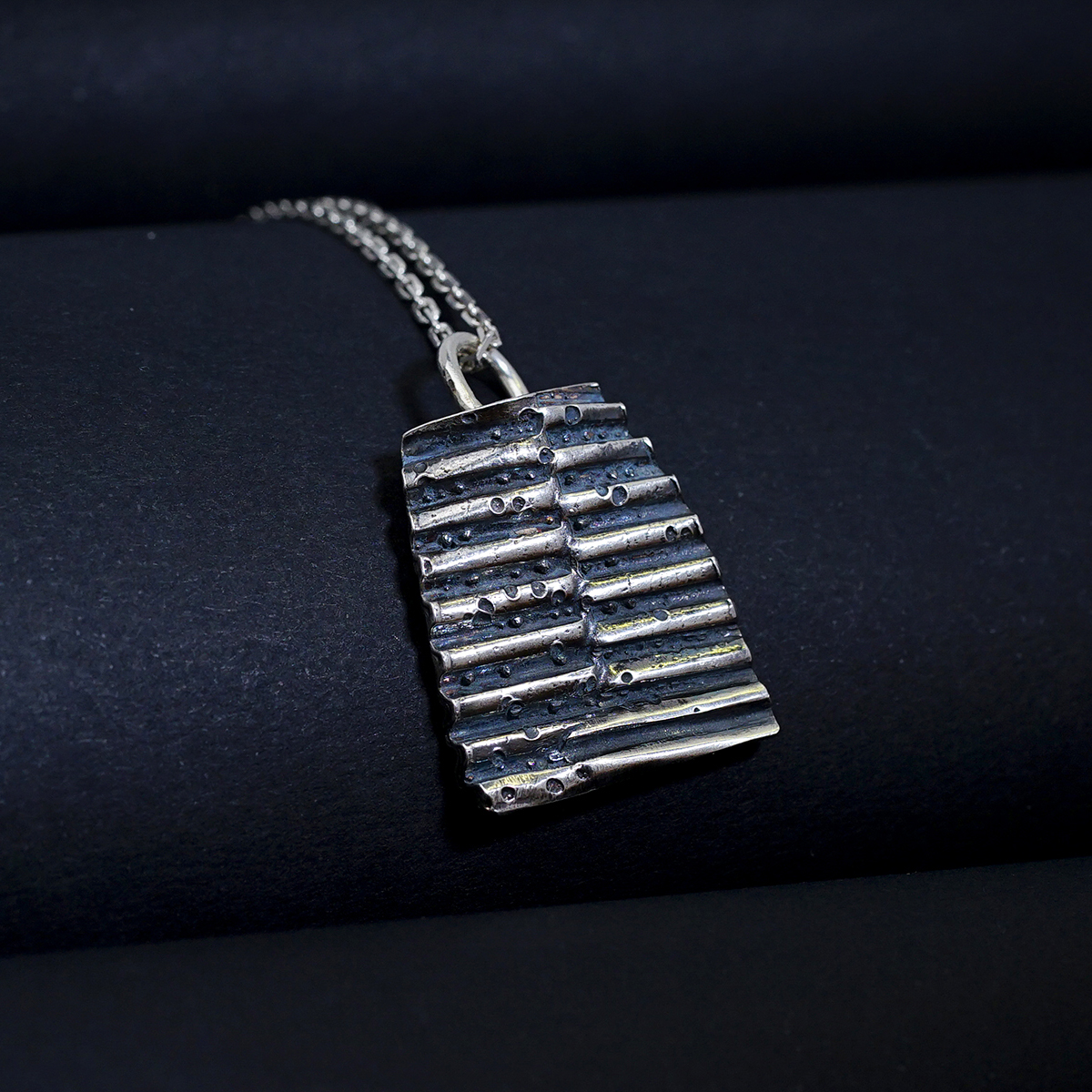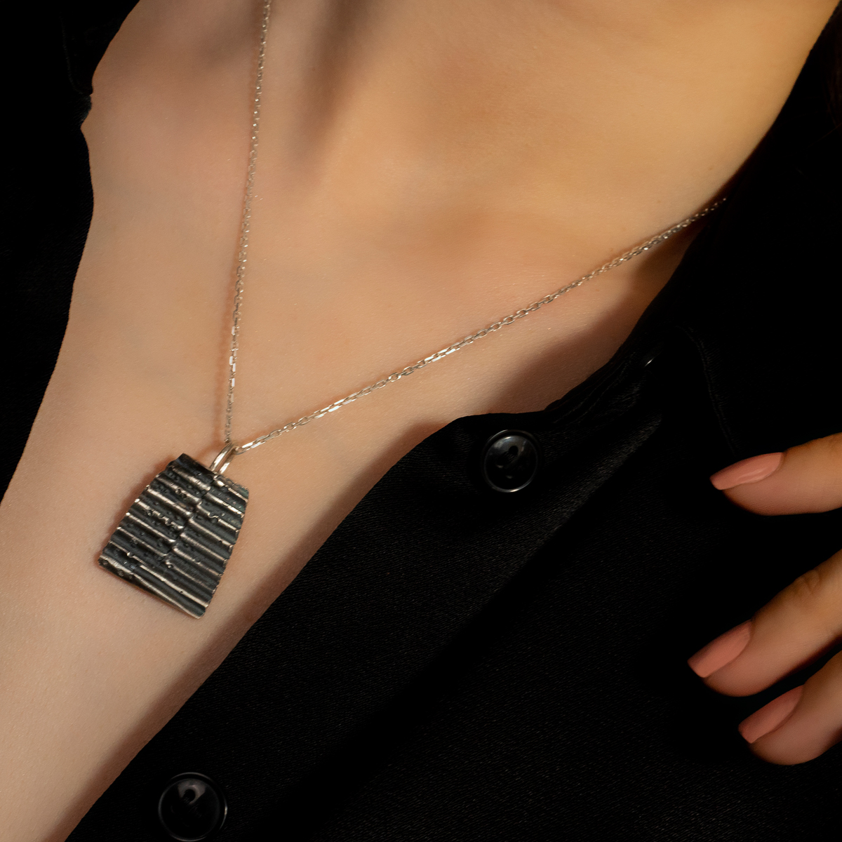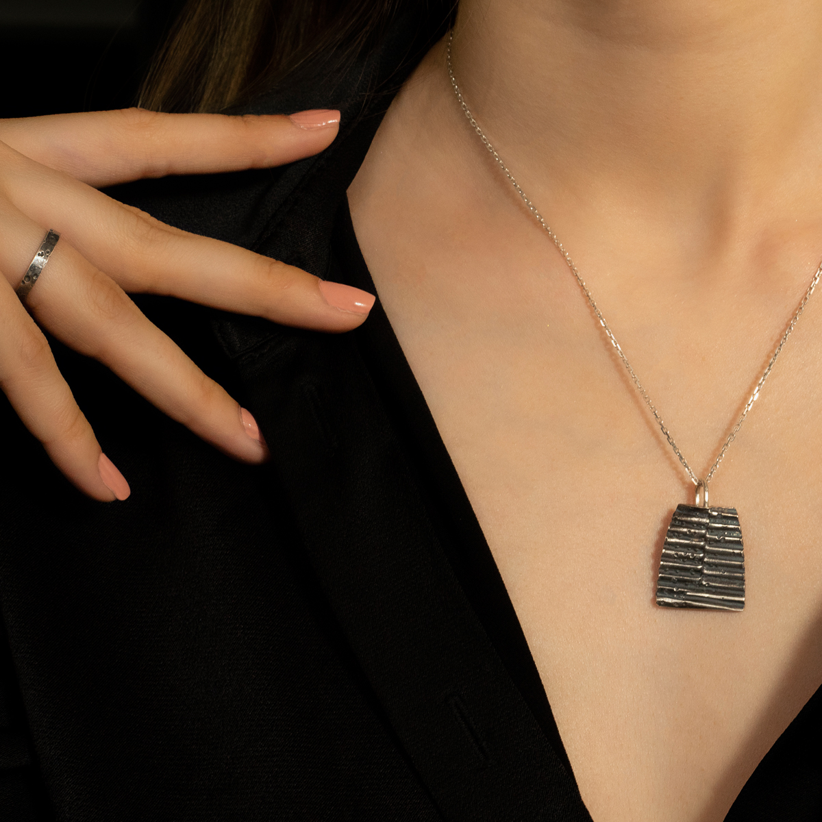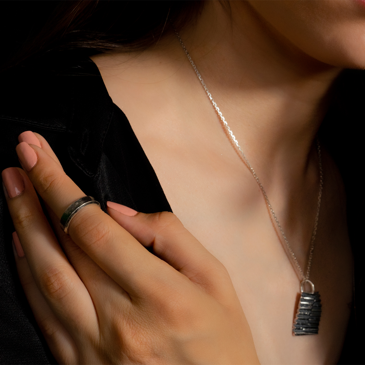 Îmbinarea liniilor inegale cu texturile evidențiate de patină fac ca designul acestui pandant să fie descris prin simplitate și complexitate în același timp. Un oximoron al bijuteriilor contemporane.
