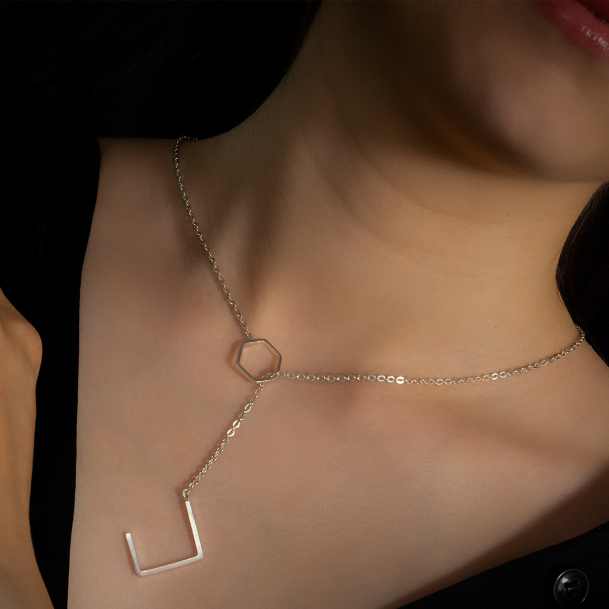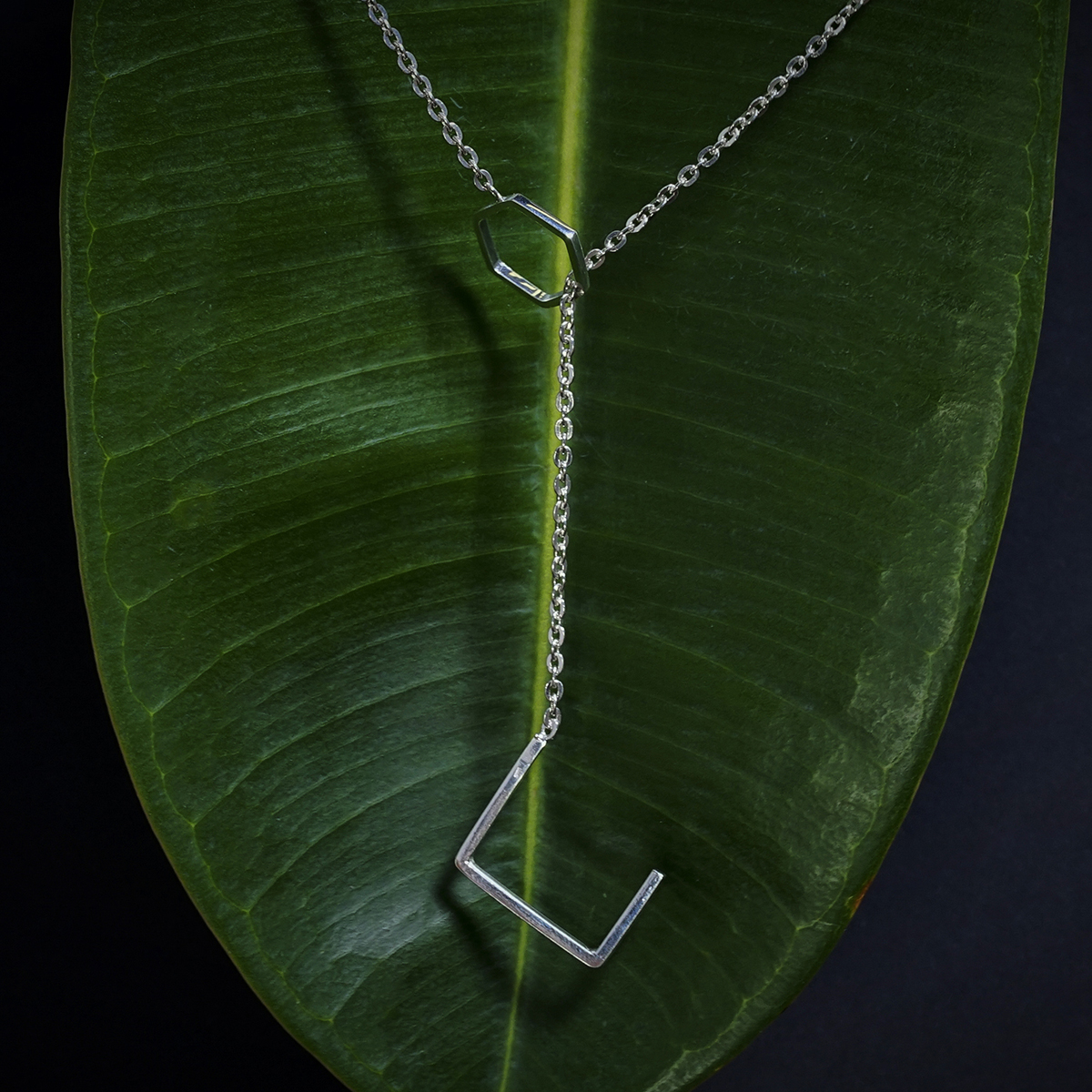 Un colier minimalist, din argint, cu forme geometrice, ușor de purtat. Modul de prindere îți dă posibilitatea de a ajusta lungimea lanțului.