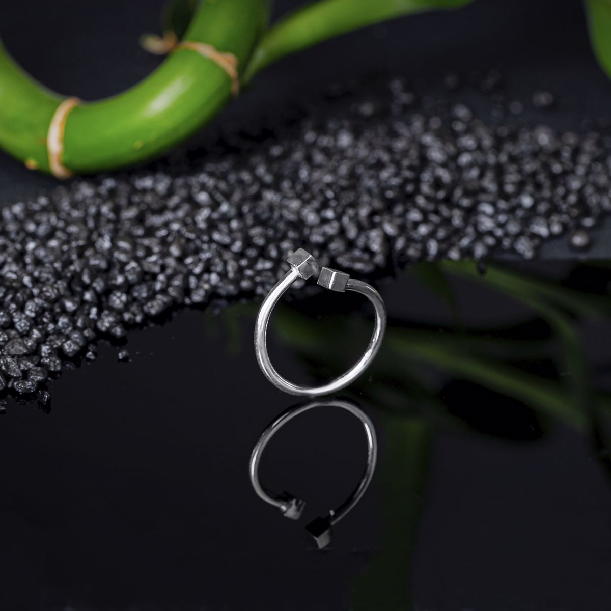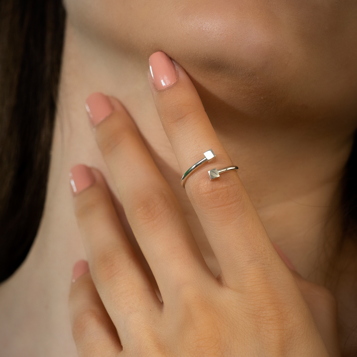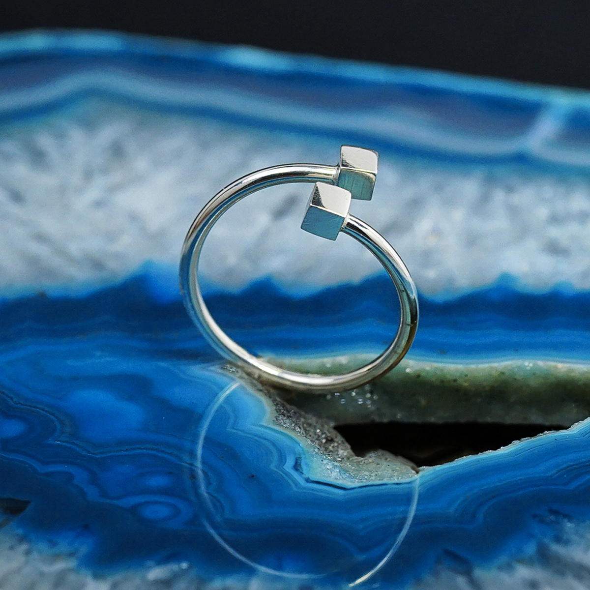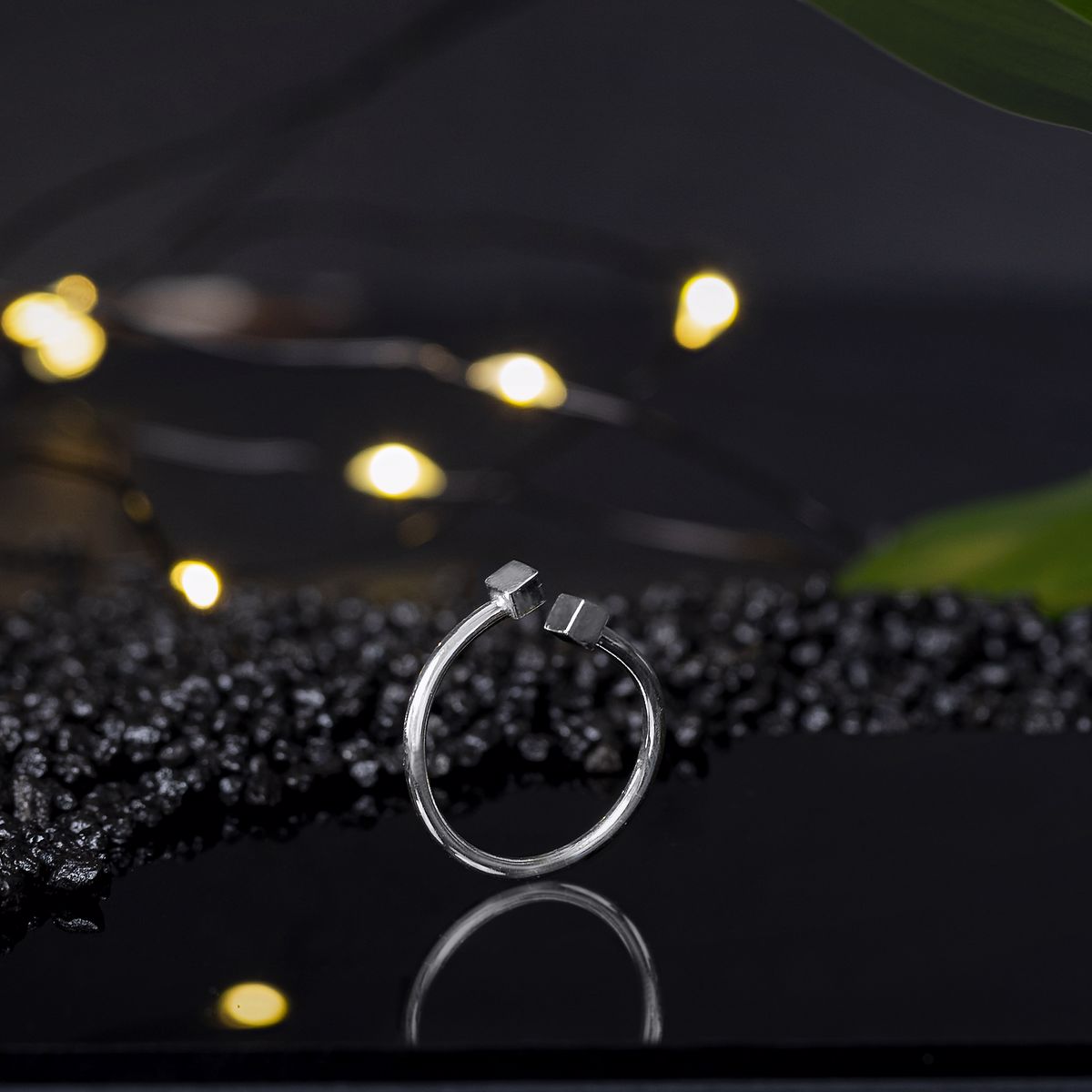 Simplitatea acestui inel este cuceritoare. O mică parte dintr-o spirală culminează în două cuburi care par că vor să se atingă, dar doar se privesc peste umăr. O mică poveste despre farmec și atracție într-un inel din argint în stil minimalist.