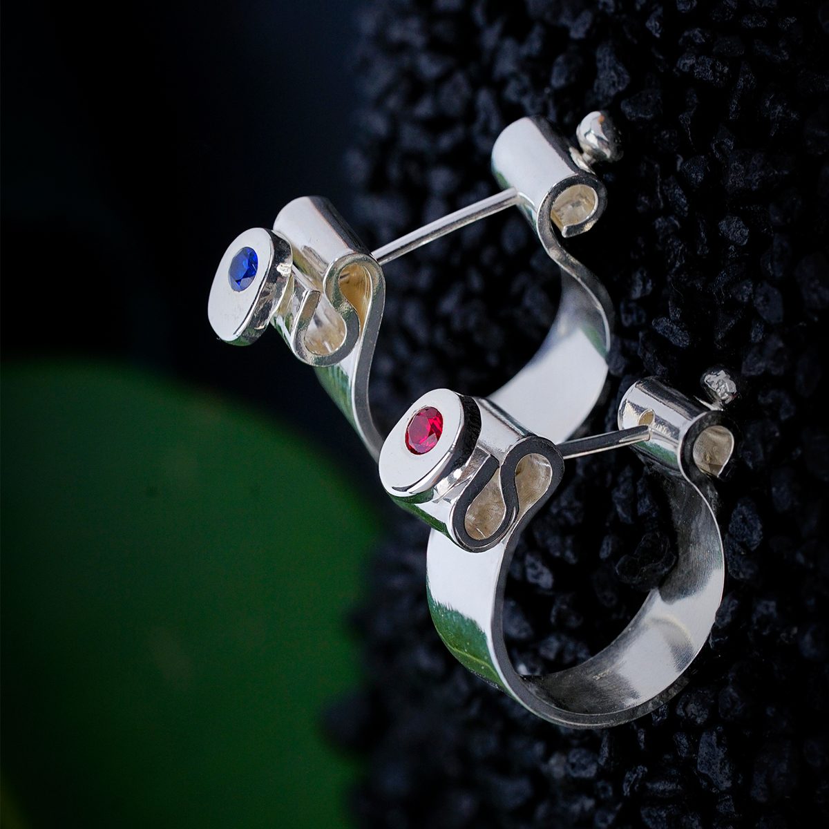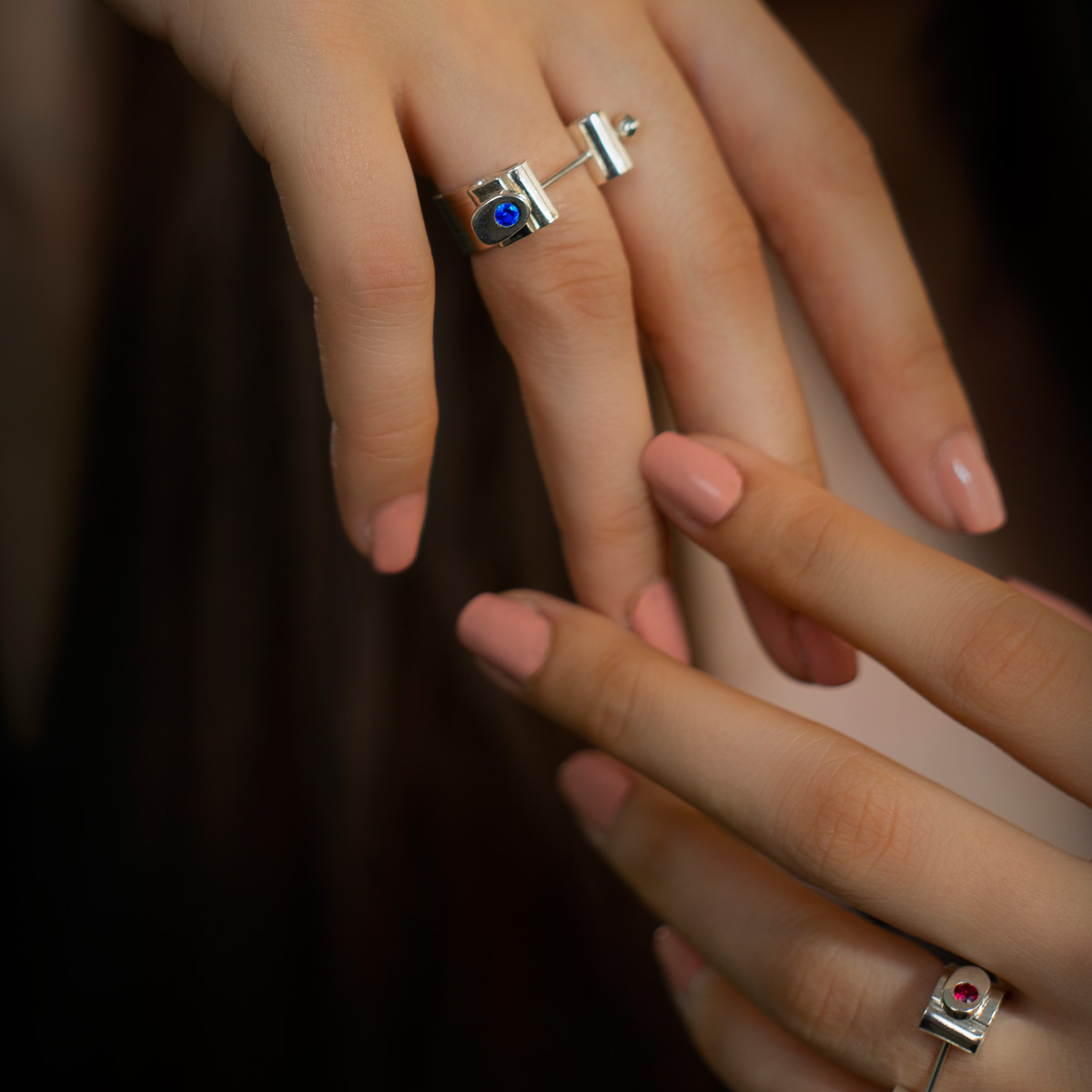 Un inel din argint cu un design curajos și surprinzător. Alege culoarea pietrei, din cele 7 culori.